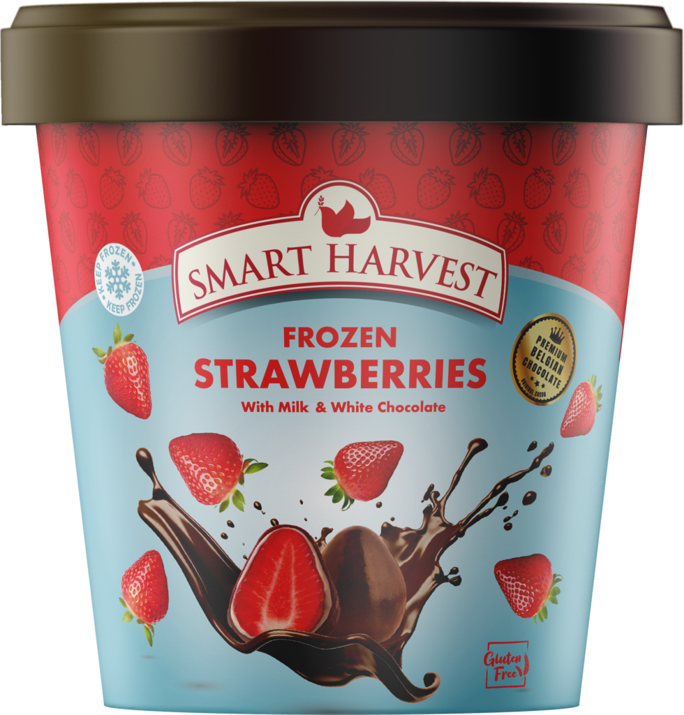 The fresh texture of real strawberries meets the enchanting taste of Belgian chocolate! Smart Harvest Frozen Strawberries offer a unique snack experience where carefully selected strawberries are covered in milk and white chocolate and frozen.